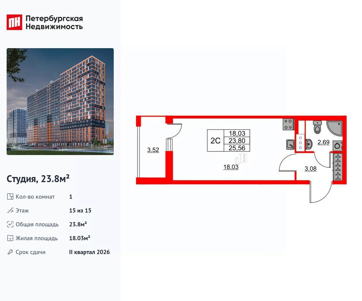 Удобная, классическая, функциональная европланировка, вместительная прихожая 3.08 м². Общая площадь студии - 23.8 м², жилая 18.03 м², высота потолка 3 м.
