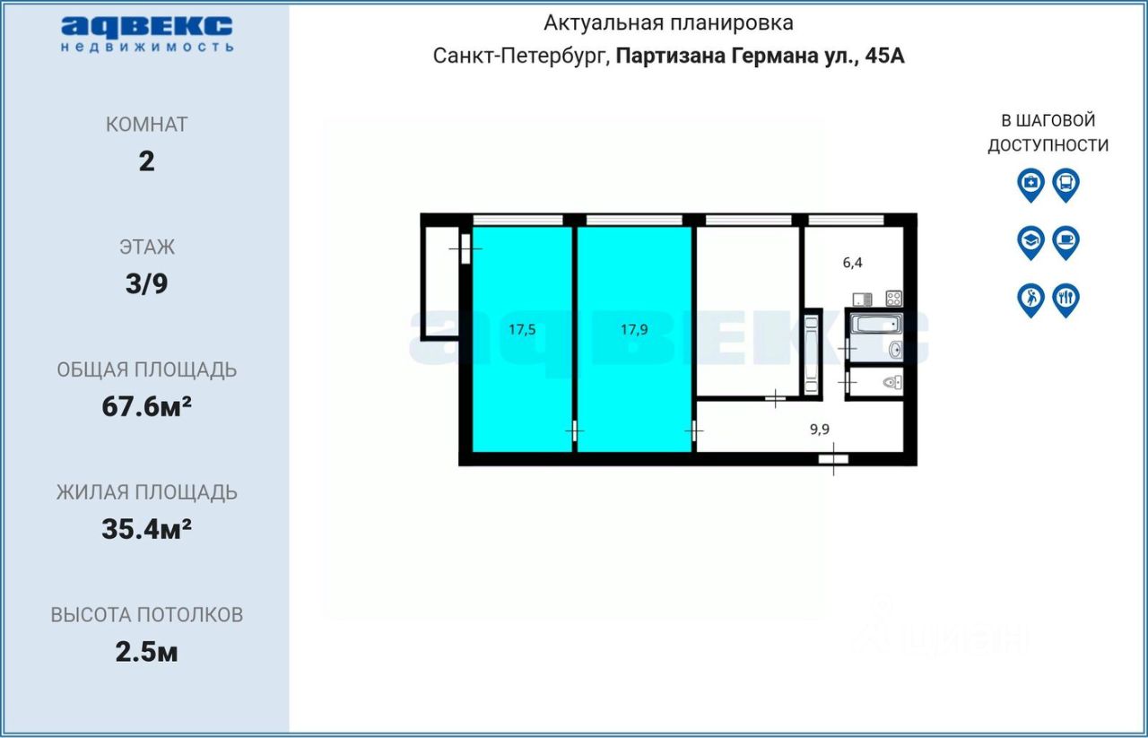 Общая площадь квартиры - 67,6 кв.м (без учета лоджии), комнаты - 17,9 кв.м+17,5 кв.м (с лоджией), кухня 6,4 кв.м.