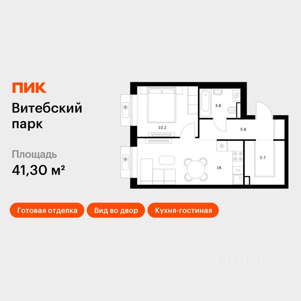Продаётся 1-комн. квартира площадью 41,3 кв.м на 2 этаже 12 этажного дома (Корпус 6, Секция 3) проекта ПИК Витебский парк. Светлый просторный подъезд на уровне земли, функциональная планировка, большие окна, c отделкой.