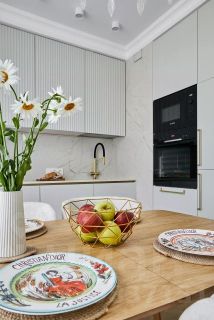 Кухня-гостиная 18 кв м: кухонный гарнитур в эмали, столешница камень, техника Bosh, стол в шпоне, удобный диван, который раскладывается