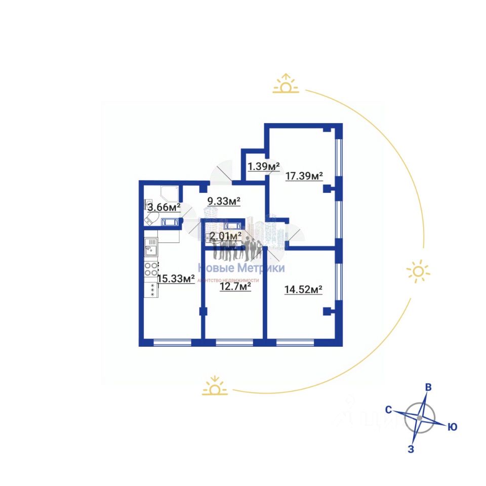 В двух из трех комнат установлены по два окна, а в одной из них предусмотрена удобная гардеробная/кладовка, что позволит максимально эффективно использовать пространство.