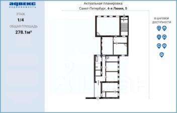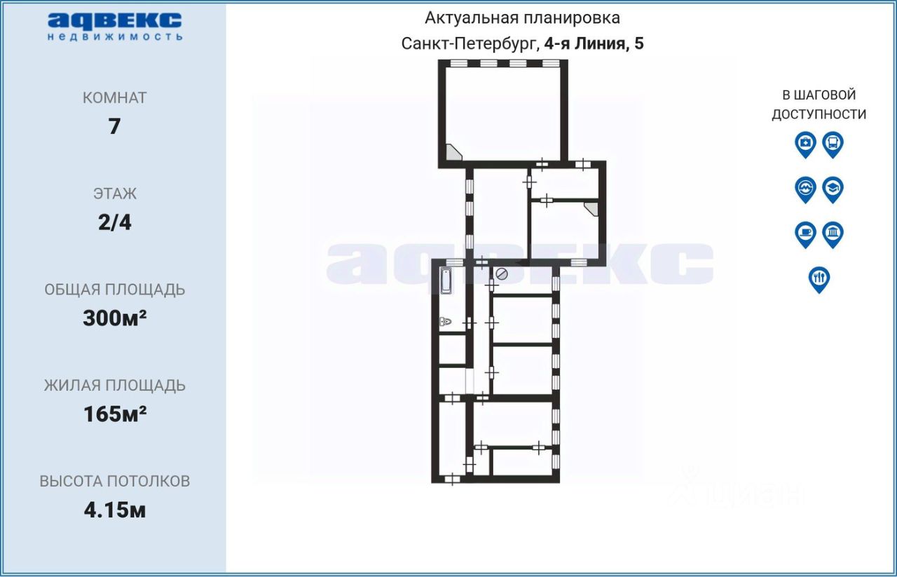 Квартира имеет комфортное зонирование: гостиная с видом на линию, столовая и кухня, соединяются с приватной зоной четырех просторных спален через проходную комнату - библиотеку. Три камина, лепнина на потолке, высокие классические межкомнатные двери, бронзовые дверные ручки. Просторные санузлы. Есть второй выход - на широкую лестницу с жилыми квартирами.