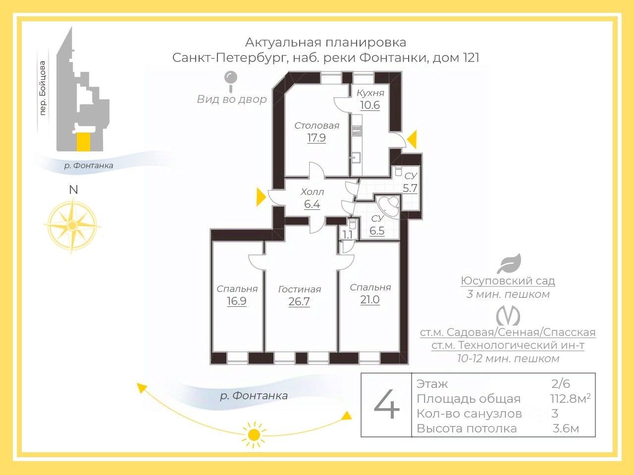 4 окна жилых комнат квартиры выходят на реку Фонтанку, открывая прекрасный вид, 2 окна - кухни и столовой выходят в тихий двор, в котором при желании можно организовать зону отдыха.