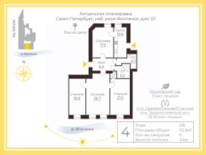 Квартира двухсторонняя, общей площадью 112,8 кв.м., высота потолков 3,63 кв.м.