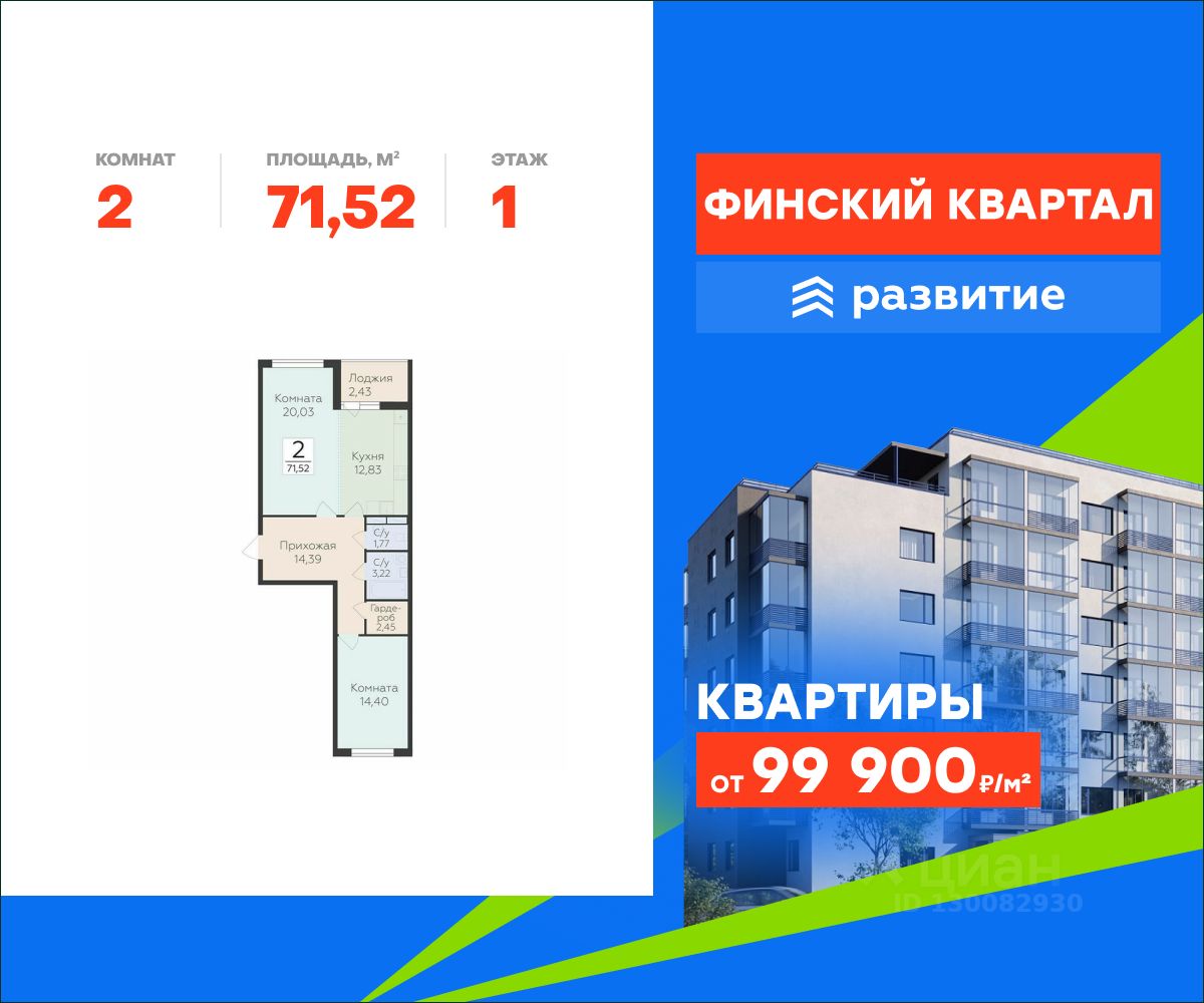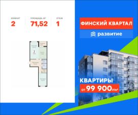 Продается квартира площадью 71.52 кв. м без отделки. Квартира расположена на 1 этаже 7 этажного дома, в жилом комплексе комфорт-класса "Финский Квартал".