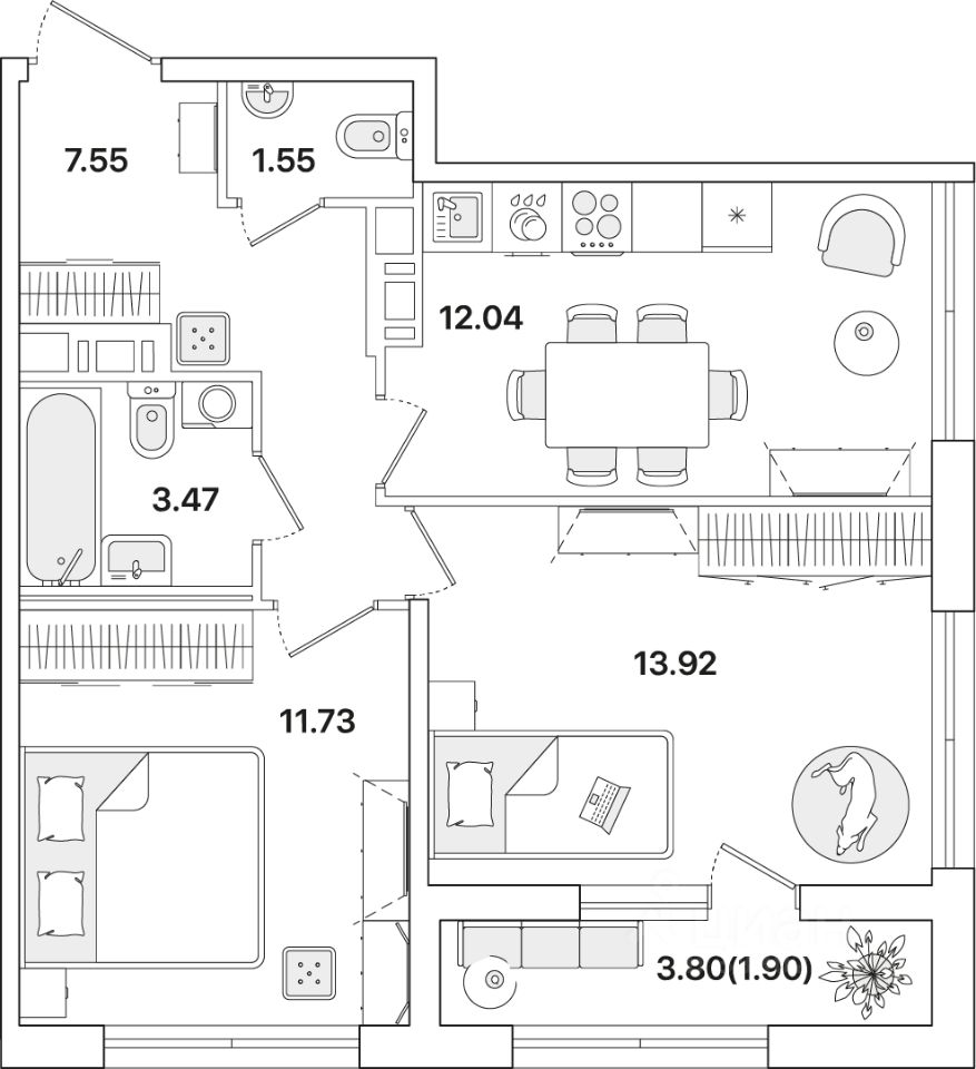 Квартира находится в 12 этажном доме, в Академик Жилой дом 1 на 7 этаже. Общая площадь квартиры 51,80 кв.м.