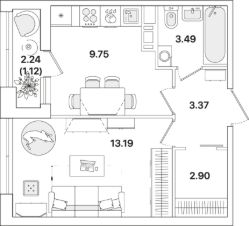 Квартира находится в 12 этажном доме, в Академик Жилой дом 1 на 10 этаже. Общая площадь квартиры 33,70 кв.м.
