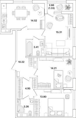 В доме есть квартиры разных метражей от студий до трехкомнатных, в том числе европланировки с просторной кухней-гостиной, а также лоты с мастер-спальнями. Квартиры на верхних этажах (10-м, 11-м и 12-м) имеют увеличенную площадь остекления и более высокие потолки (до 3 метров). Есть варианты с чистовой отделкой, предчистовой отделкой white box и без отделки.