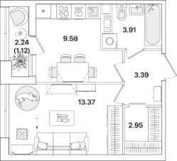 Квартира находится в 12 этажном доме, в Академик Жилой дом 1 на 6 этаже. Общая площадь квартиры 34,40 кв.м.