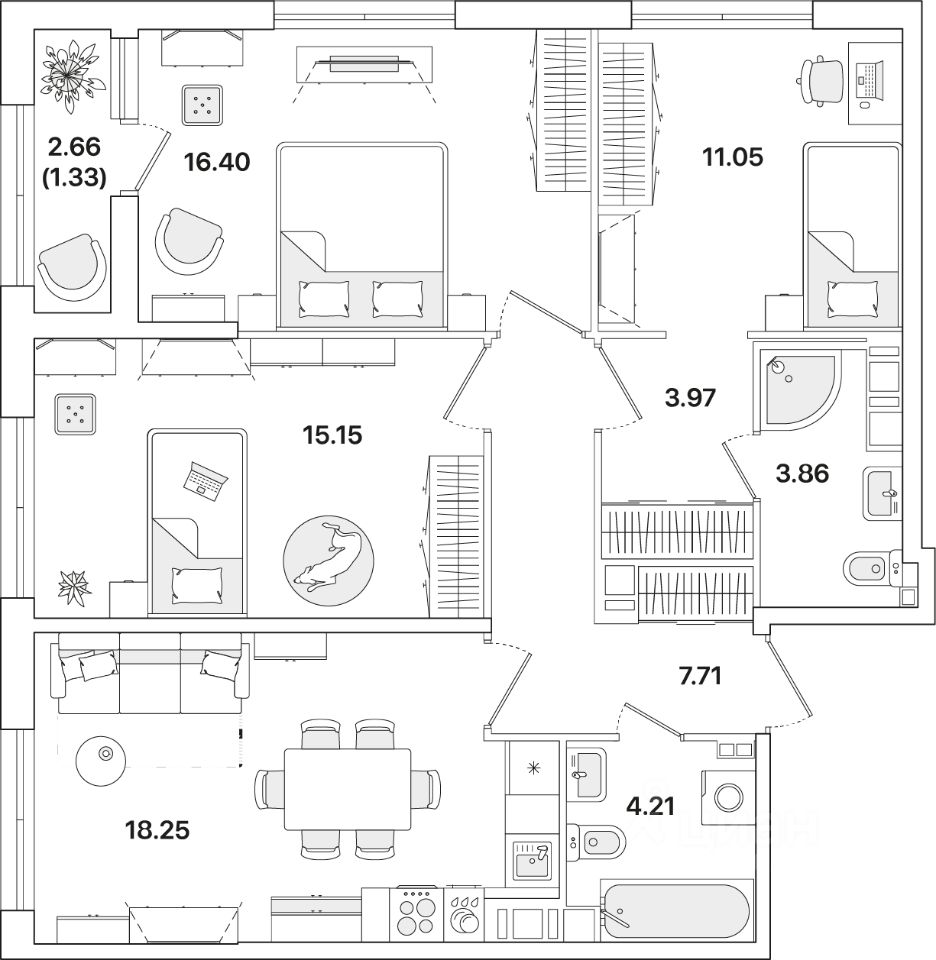В доме есть квартиры разных метражей от студий до трехкомнатных, в том числе европланировки с просторной кухней-гостиной, а также лоты с мастер-спальнями. Квартиры на верхних этажах (10-м, 11-м и 12-м) имеют увеличенную площадь остекления и более высокие потолки (до 3 метров). Есть варианты с чистовой отделкой, предчистовой отделкой white box и без отделки.