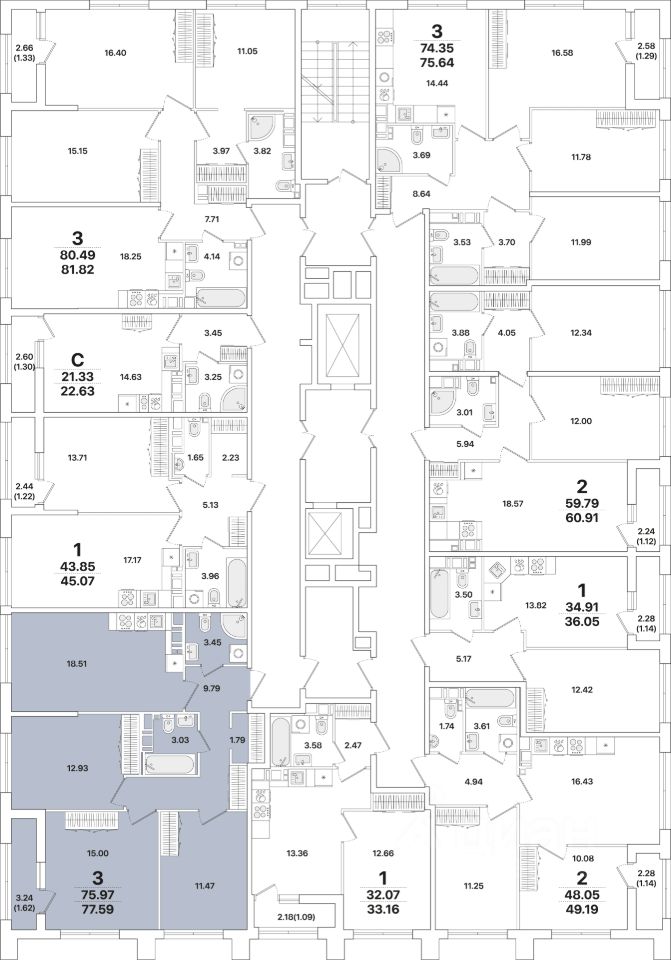 Квартира находится в 12 этажном доме, в Академик Жилой дом 2 на 12 этаже. Общая площадь квартиры 77,59 кв.м.