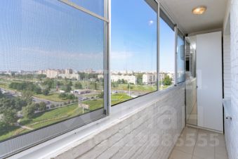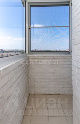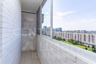 Большая застеклённая лоджия (6,3 кв. м) с удобными шкафами, где можно наслаждаться утренним кофе и видом на город.