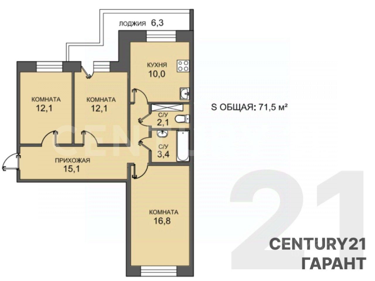 Три светлые и уютные комнаты (12,1 + 12,1 + 16,8 кв. м), где каждый найдёт своё пространство для отдыха и творчества.