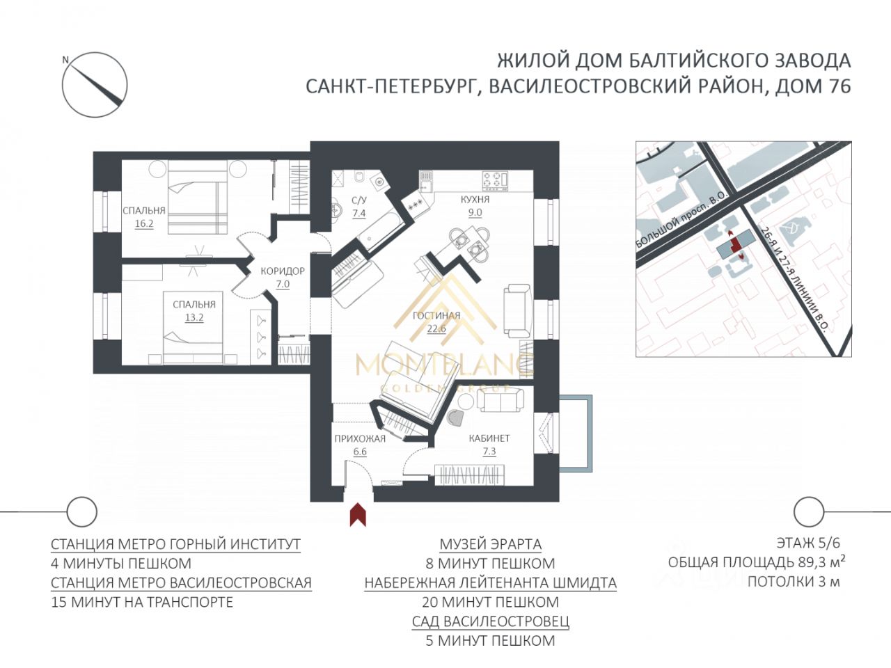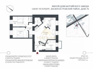 Район — в фазе яркого ренессанса: новые станции метро, рост бизнес-застройки, соседство с клубными домами, стихийное культурное перерождение. В 15 минутах — Севкабель порт и Брусницын. В 12 — набережная Невы. Через дорогу — сад Василеостровец. Всё, что нужно, в буквальном смысле под рукой: ТЦ с кинотеатром, аптеки, пекарни, школы, кофейни, рестораны, ДК им. Кирова. Пространство — живое, прогретое, насыщенное, но без перенасыщения. Оно для тех, кто умеет быть в ритме, не теряя себя.