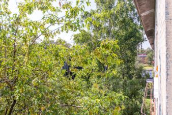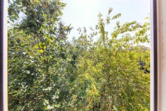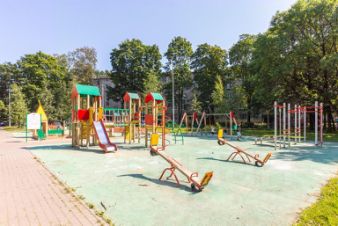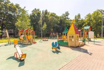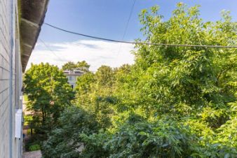 Дом в тихом, утопающем в зелени районе, из окнон открывается вид на просторную детскую площадку.