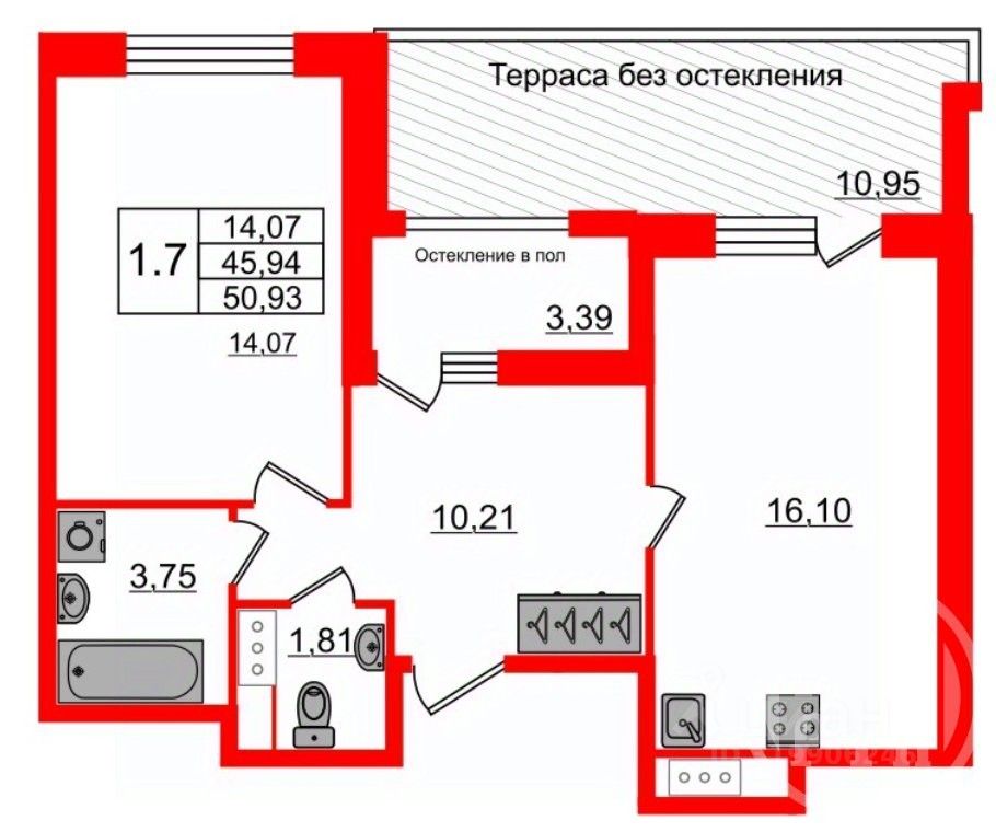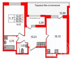 Общая площадь квартиры составляет 50,93 кв. м, с жилой зоной 14.07 кв. м и просторной кухней площадью 16.1 кв. м.