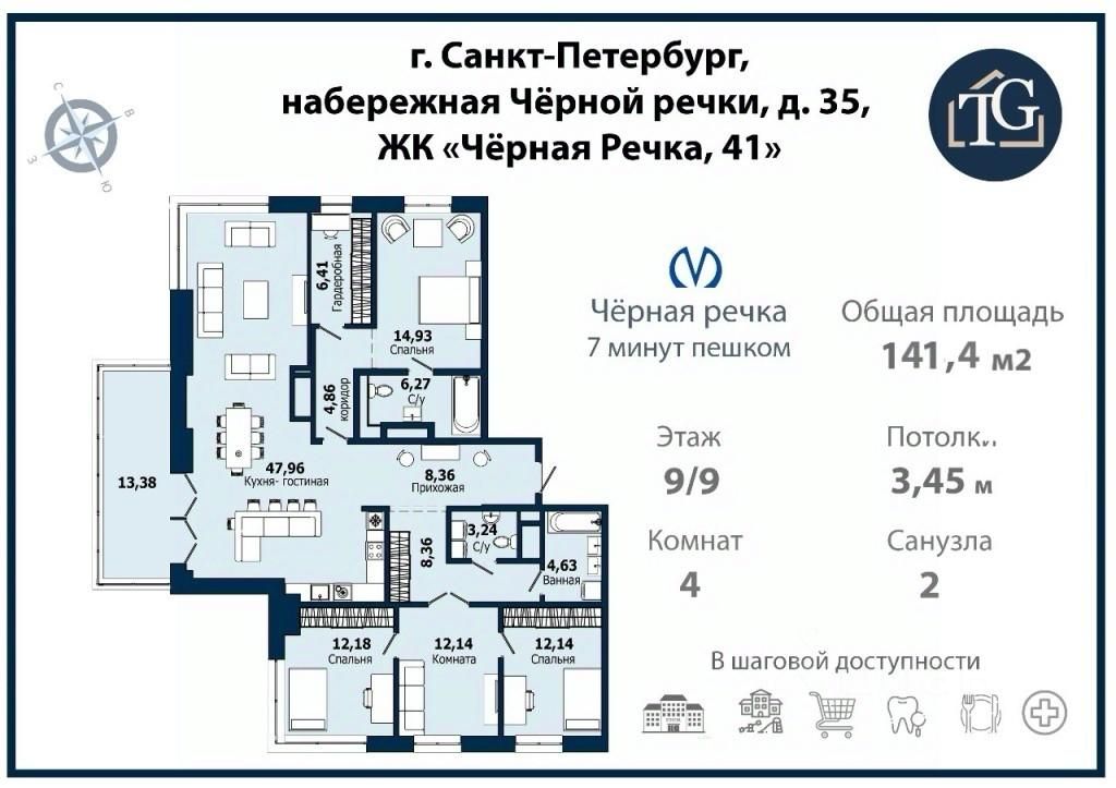 — Отличная планировка с большой кухней-гостиной 47,96 кв. м. с выходом на террасу 13,38 кв. метров и панорамным видом на Черную речку;