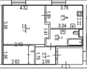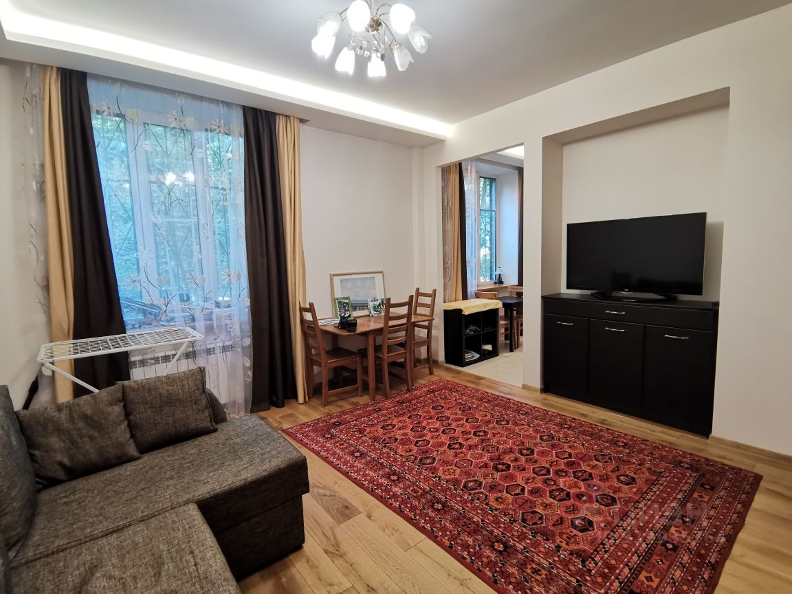 Общая площадь 42 кв.м., жилая площадь 29 кв.м., большой санузел 6 кв.м., высота потолков 3 м., окна выходят в тихий двор без машин;
