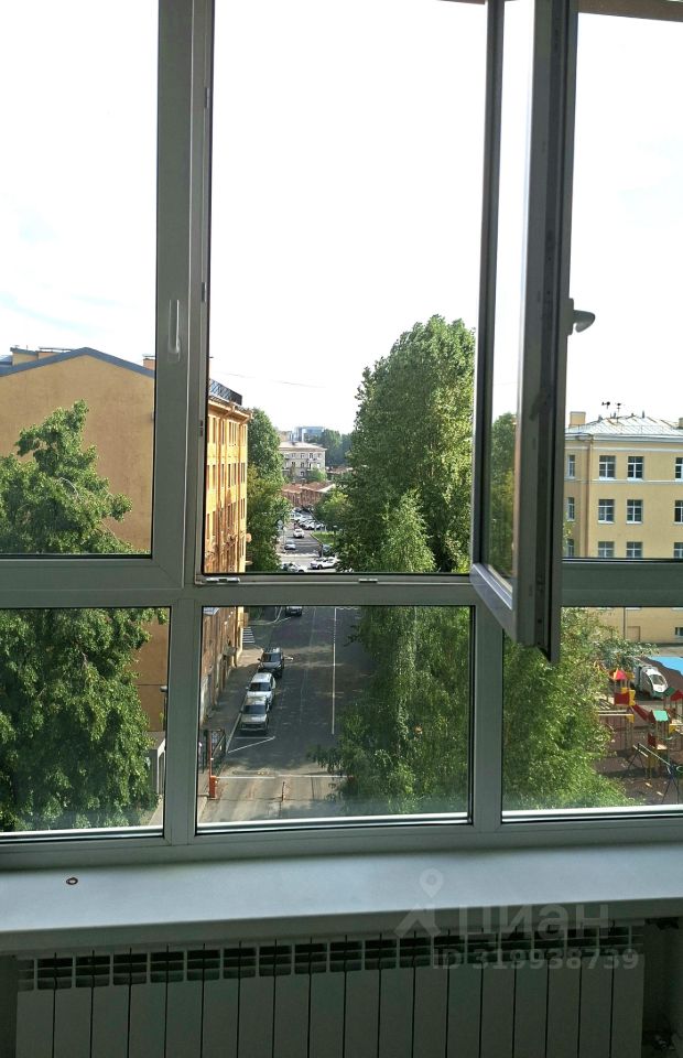 Из гостиной окна с видом на перпективу в сторону центра. Открытое широкое пространство с зеленью и небом.