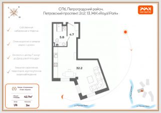Просторная кухня-столовая и спальня объединены в единое пространство площадью 32 м², открывающее великолепный вид на воду и историческую часть Васильевского острова. Просторный совмещенный санузел (5,8 м²), выполненный из натурального камня, а также функциональная гардеробная и холл (5 м²) добавляют удобства в повседневную жизнь.