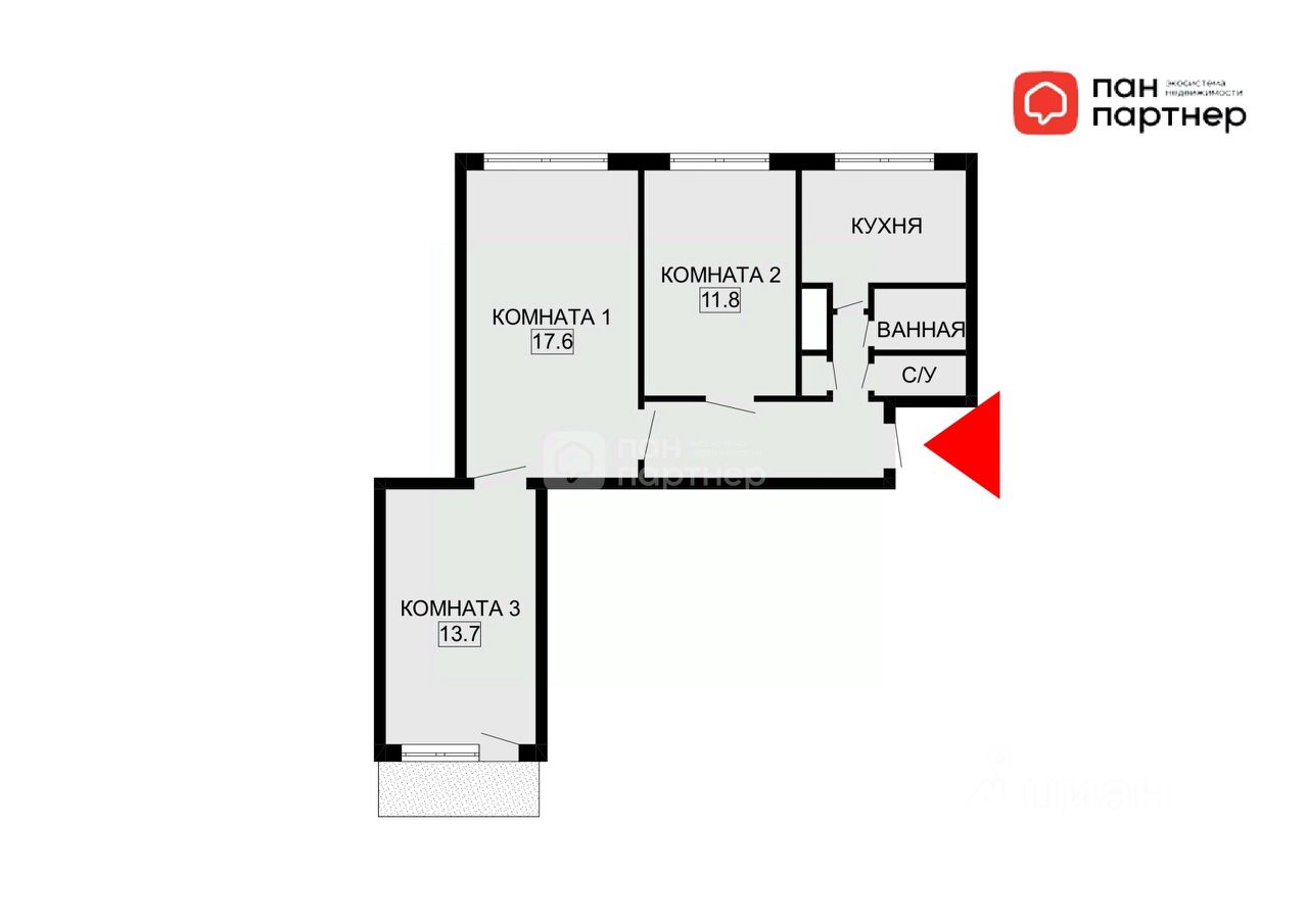 В квартире три комнаты с площадью 13,7 кв. м, 17,6 кв. м и 11,8 кв. м соответственно.