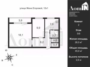 Общая площадь квартиры составляет 45 кв.м. Две комнаты правильной квадратной формы площадью 18,1 и 9,9 кв.м, расположены окнами во двор (юго-запад).