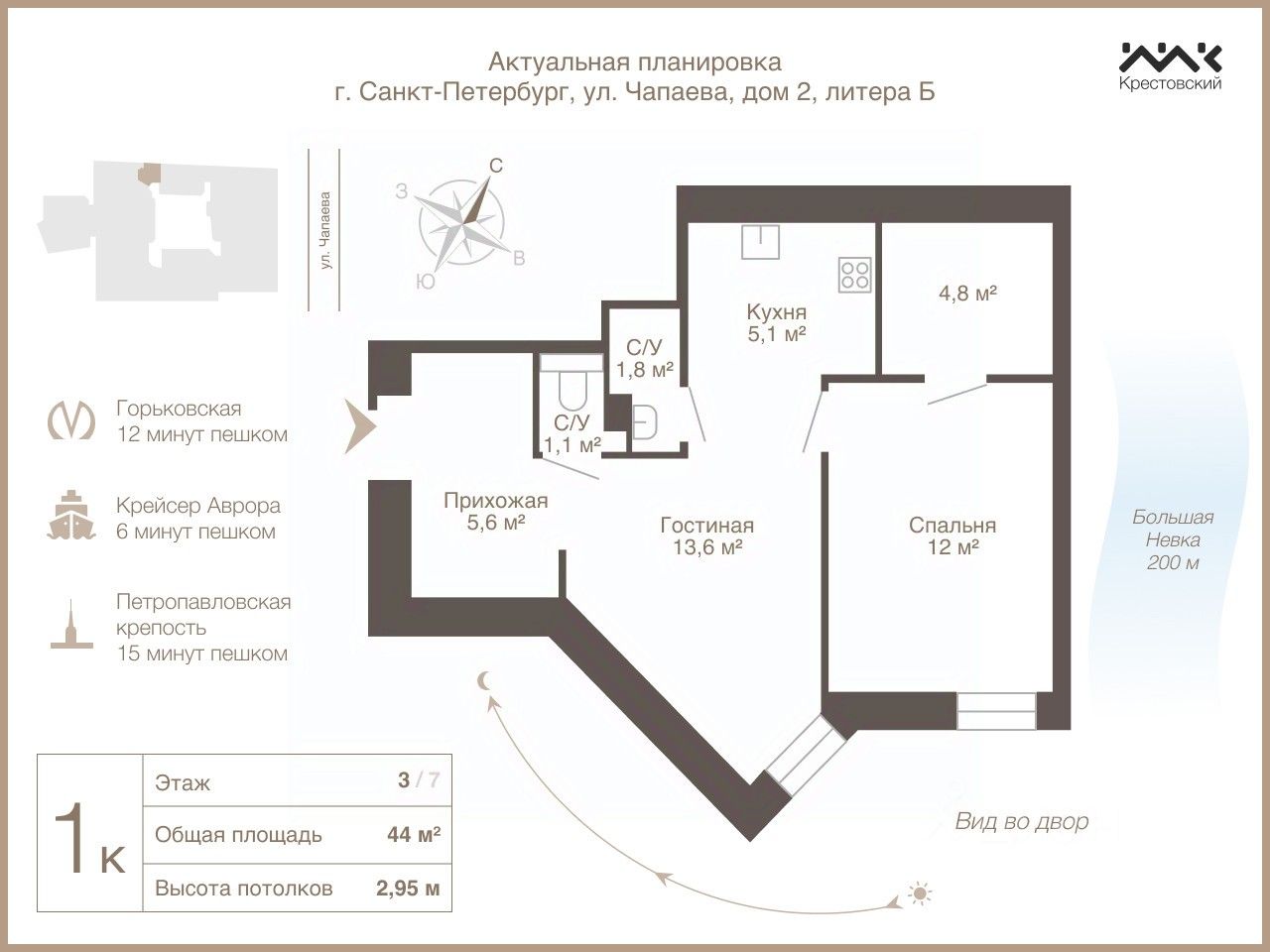 В двух шагах от дома располагается Петроградская набережная, в шаговой доступности вся базовая инфраструктура: магазины, кафе и рестораны, парки, бизнес-центры, школы, учебные заведения. На общественном транспорте можно за 10 минут добраться до станции метро Петроградская, поблизости располагается выезд на Сампсониевский мост. На машине от нашего адреса можно за полчаса добраться в любую точку города.