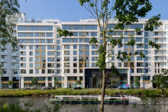 Интерьеры общественных мест: Лобби зоны выполнены по проекту известного дизайнера Филиппа Старка и "Студии 17". В парадной установлен камин, мягкая мебель для комфорта, русский бильярд и кофе-станция. Лаконичные фасады из керамогранита благородных светлых тонов в обрамлении золотых колонн и парящих небесно-голубых балконов создают неповторимый образ комплекса.