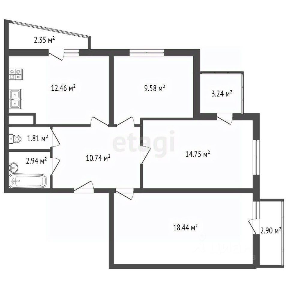 Планировка включает три изолированные комнаты площадью 18,44 м², 14,75 м² и 9,58 м², просторную кухню 12,46 м² с выходом на балкон.