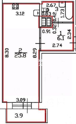Одно большое помещение площадью 25.8 м2.