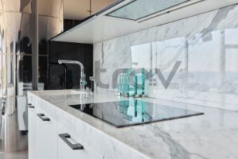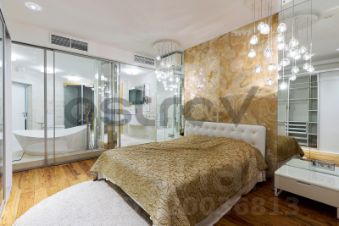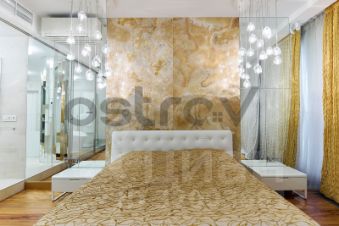 Возвращаясь к мастер-спальне, следует уделить внимание Спа-зоне, которая отделена от самой спальни светопрозрачной конструкцией. Тем самым, лежа в ванне или находясь в сауне, вы будете видеть залив! Декоративным элементом за изголовьем кровати выступает натуральный оникс. На полу паркет из натуральной оливы.