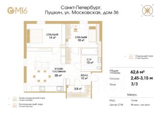 Площадь: 62,6 м² (жилая 24 м², кухня 20 м²)