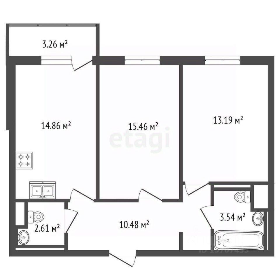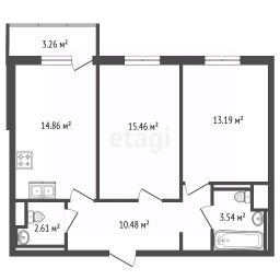 Площадь квартиры составляет 60,14 м², она выполнена в современной планировке с раздельными комнатами и просторной кухней-гостиной 14,9 м².
