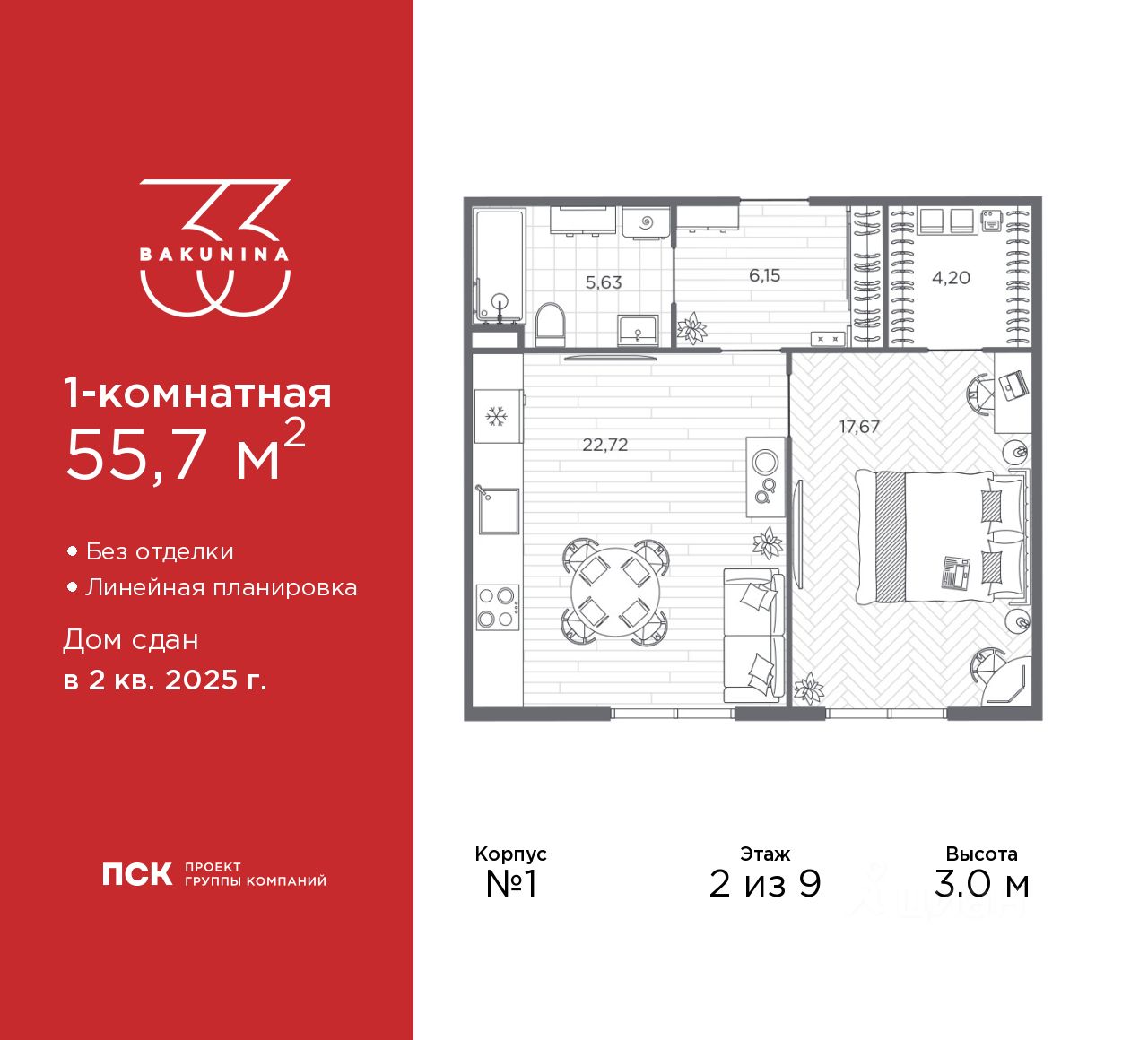 Продается 1-комн. квартира в ЖК "BAKUNINA 33" на 2 этаже. Квартира без отделки, новый владелец может сделать ремонт по индивидуальному дизайн-проекту. Общая площадь: 55.7 кв.м., жилая: 17.67 кв.м., площадь просторной кухни-столовой: 22.72 кв.м. Все окна выходят на одну сторону. В квартире один совмещенный санузел. Высота потолков 3.0 м.