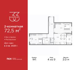 2-комн. квартира от застройщика в ЖК "BAKUNINA 33" на 4 этаже. Квартира без отделки, новый собственник может сделать ремонт по своему дизайн-проекту. Общая площадь: 72.5 кв.м., жилая: 35.11 кв.м., площадь просторной кухни-столовой: 15.36 кв.м. Квартира - распашонка, без проходных комнат, окна выходят на paзные стороны дома. В квартире одна лоджия, один совмещенный и один раздельный санузел. Высота потолков 3.0 м.