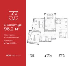 Продается 3-комн. квартира в ЖК "BAKUNINA 33" на 4 этаже. Квартира без отделки, после выдачи ключей можно делать ремонт. Общая площадь: 96.2 кв.м., жилая: 54.7 кв.м., площадь просторной кухни-столовой: 17.11 кв.м. Угловая квартира, очень светлая, естественная вентиляция при открытии окон. В квартире три совмещенных санузла. Высота потолков 3.0 м.