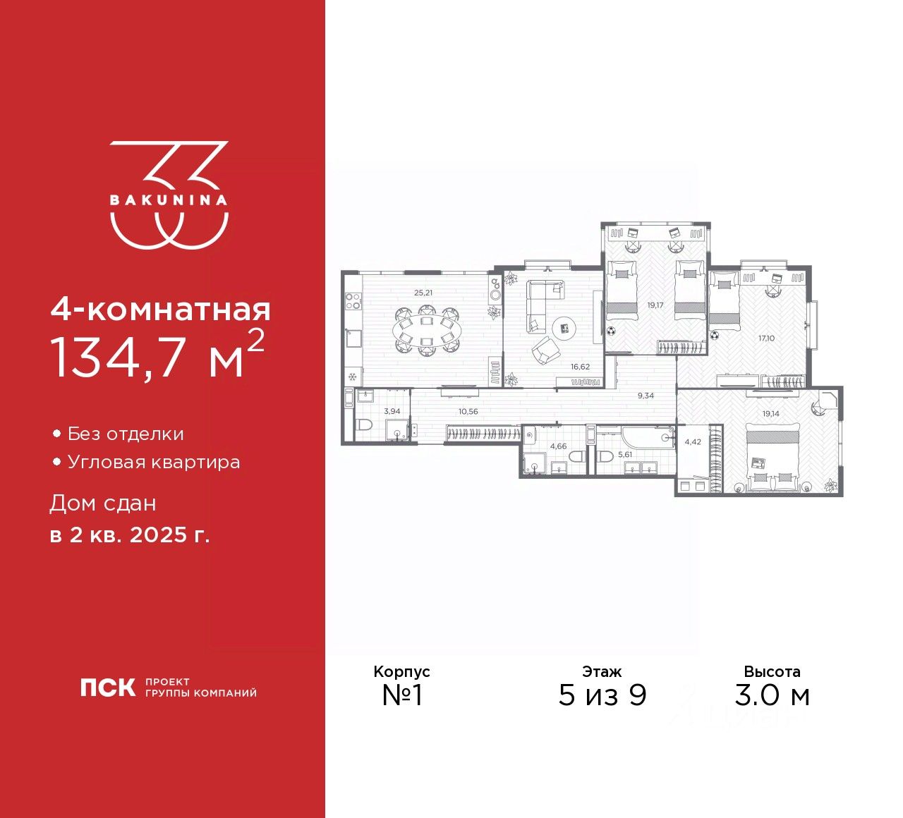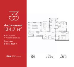 Продается 4-комн. квартира в ЖК "BAKUNINA 33" на 5 этаже. Квартира без отделки, новый собственник может сделать ремонт по индивидуальному дизайн-проекту. Общая площадь: 134.7 кв.м., жилая: 72.03 кв.м., площадь просторной кухни-столовой: 25.21 кв.м. Угловая квартира, очень светлая, естественная вентиляция при открытии окон. В квартире три совмещенных санузла. Высота потолков 3.0 м.