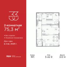 2-комн. квартира в ЖК "BAKUNINA 33" на 5 этаже. Квартира без отделки, после оформления собственности можно делать ремонт. Общая площадь: 75.3 кв.м., жилая: 38.73 кв.м., площадь просторной кухни-столовой: 18.79 кв.м. Комнаты изолированные, все окна выходят на одну сторону. В квартире два совмещенных санузла. Высота потолков 3.0 м.