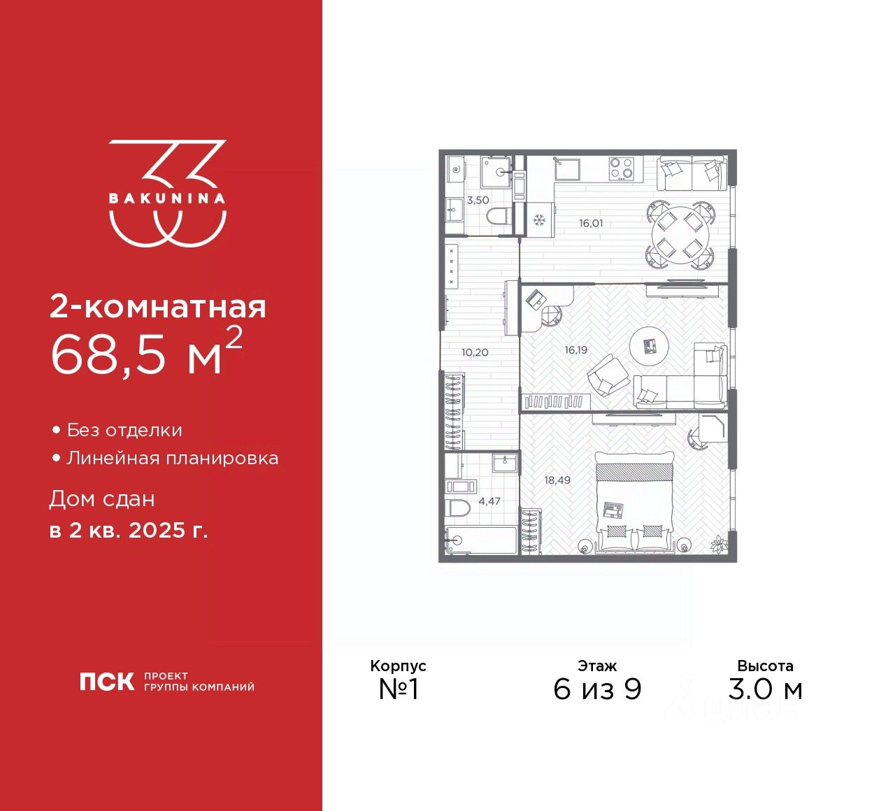 Просторная 2-комн. квартира в ЖК "BAKUNINA 33" на 6 этаже. Квартира без отделки, новый владелец может сделать ремонт по индивидуальному дизайн-проекту. Общая площадь: 68.5 кв.м., жилая: 34.68 кв.м., площадь просторной кухни-столовой: 16.01 кв.м. Комнаты изолированные, все окна выходят на одну сторону. В квартире два совмещенных санузла. Высота потолков 3.0 м.