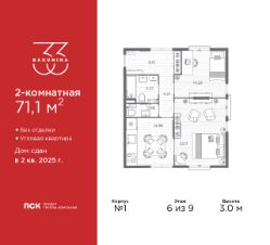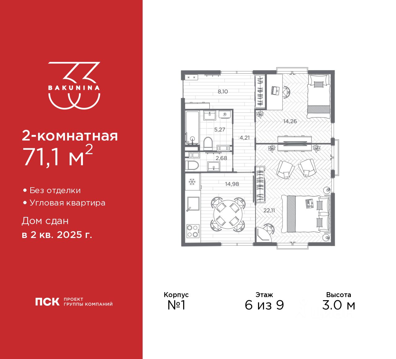 Просторная двухкомнатная квартира в ЖК "BAKUNINA 33" на 6 этаже. Квартира без отделки, полностью готова к чистовой отделке и дальнейшему ремонту. Общая площадь: 71.1 кв.м., жилая: 36.37 кв.м., площадь просторной кухни-столовой: 14.98 кв.м. Квартира угловая, идеально подойдет любителям тишины и панорамных видов. В квартире один совмещенный и один раздельный санузел. Высота потолков 3.0 м.