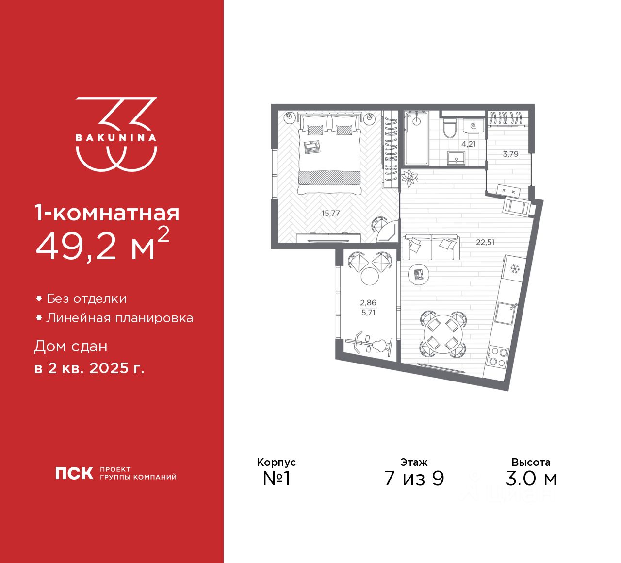 Продается 1-комн. квартира в ЖК "BAKUNINA 33" на 7 этаже. Квартира без отделки, после оформления собственности можно делать ремонт. Общая площадь: 49.2 кв.м., жилая: 15.77 кв.м., площадь просторной кухни-столовой: 22.5 кв.м. Все окна выходят на одну сторону. В квартире одна лоджия, один совмещенный санузел. Высота потолков 3.0 м.