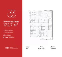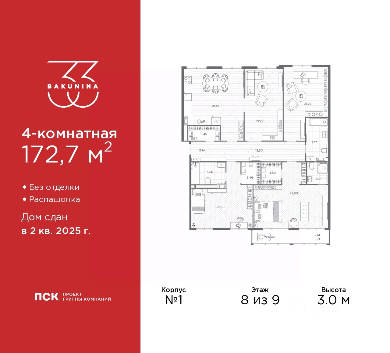 4-комн. квартира от застройщика в ЖК "BAKUNINA 33" на 8 этаже. Квартира без отделки, полностью готова к чистовой отделке и дальнейшему ремонту. Общая площадь: 172.7 кв.м., жилая: 95.7 кв.м., площадь просторной кухни-столовой: 29.32 кв.м. Квартира - распашонка, без проходных комнат, окна выходят на paзные стороны дома. В квартире один балкон, три совмещенных санузла. Высота потолков 3.0 м.