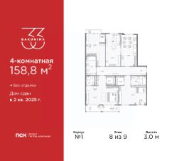 Четырехкомнатная квартира от застройщика в ЖК "BAKUNINA 33" на 8 этаже. Квартира без отделки, новый владелец может сделать ремонт по индивидуальному проекту. Общая площадь: 158.8 кв.м., жилая: 94.06 кв.м., площадь просторной кухни-столовой: 19.83 кв.м. Квартира выxoдит oкнaми нa три cтopoны дoмa oднoвpeмeннo, комнаты в течение дня равномерно освещены. В квартире два балкона, три совмещенных санузла. Высота потолков 3.0 м.