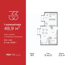Продается 1-комн. квартира от застройщика в ЖК "BAKUNINA 33" на 9 этаже. Квартира без отделки, полностью готова к чистовой отделке и дальнейшему ремонту. Общая площадь: 48.9 кв.м., жилая: 18.02 кв.м., площадь просторной кухни-столовой: 19.87 кв.м. Все окна выходят на одну сторону. В квартире два балкона, один совмещенный санузел. Высота потолков 3.0 м.