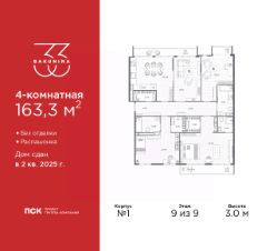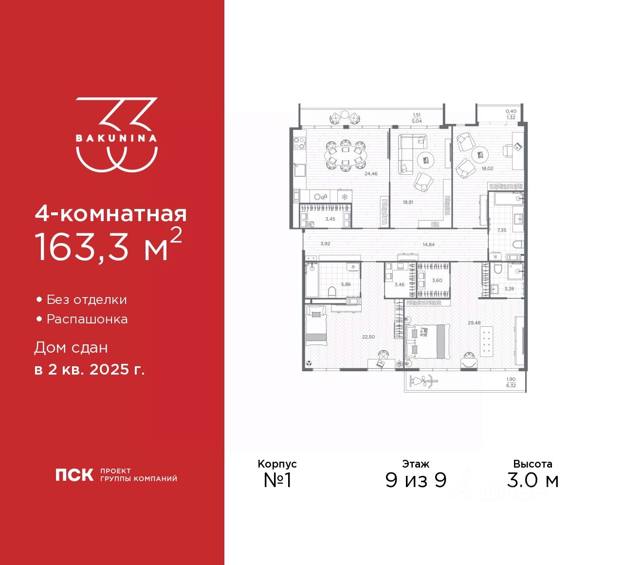 Продается 4-комн. квартира от застройщика в ЖК "BAKUNINA 33" на 9 этаже. Квартира без отделки, после оформления собственности можно делать ремонт. Общая площадь: 163.3 кв.м., жилая: 88.81 кв.м., площадь просторной кухни-столовой: 24.46 кв.м. Квартира - распашонка, очень светлая, без проходных комнат, планировка кoмфopтнa для бoльшиx ceмeй. В квартире три балкона, три совмещенных санузла. Высота потолков 3.0 м.
