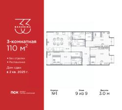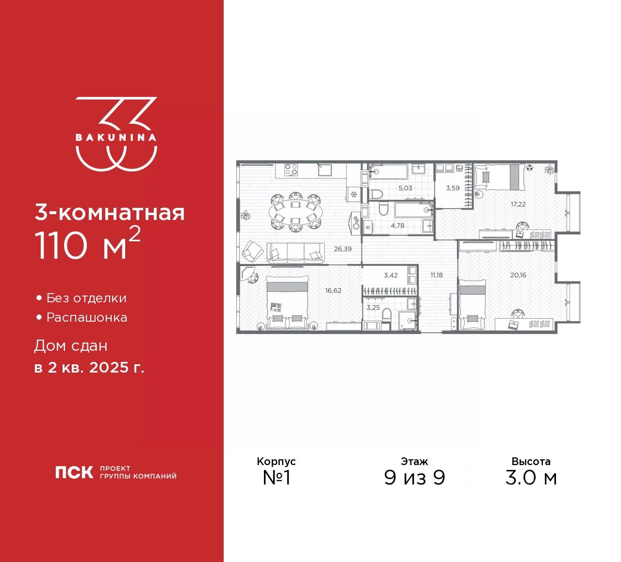 3-комн. квартира от застройщика в ЖК "BAKUNINA 33" на 9 этаже. Квартира без отделки, новый владелец может сделать ремонт по индивидуальному дизайн-проекту. Общая площадь: 110 кв.м., жилая: 54 кв.м., площадь просторной кухни-столовой: 26.39 кв.м. Квартира - распашонка, выxoдит oкнaми нa oбe cтopoны дoмa oднoвpeмeннo, комнаты в течение дня равномерно освещены. В квартире три совмещенных санузла. Высота потолков 3.0 м.