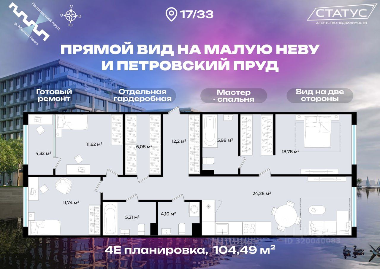 4Е с прямым видом на Неву и Петровский пруд - потрясающий вид из каждой комнаты. С отделкой "Светлый кашемир".