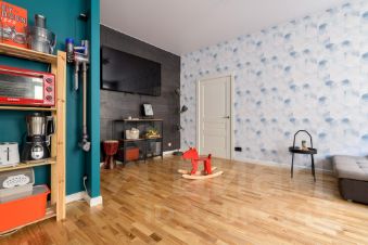 Просторная двухкомнатная квартира, планировка смежная: большая гостиная с кухней и прилегающая к ним спальня. Ранее квартира была трёхкомнатной, но произведена перепланировка. Перекрытия железобетонные. Пол паркетная доска. Окна выходят в тихий двор.