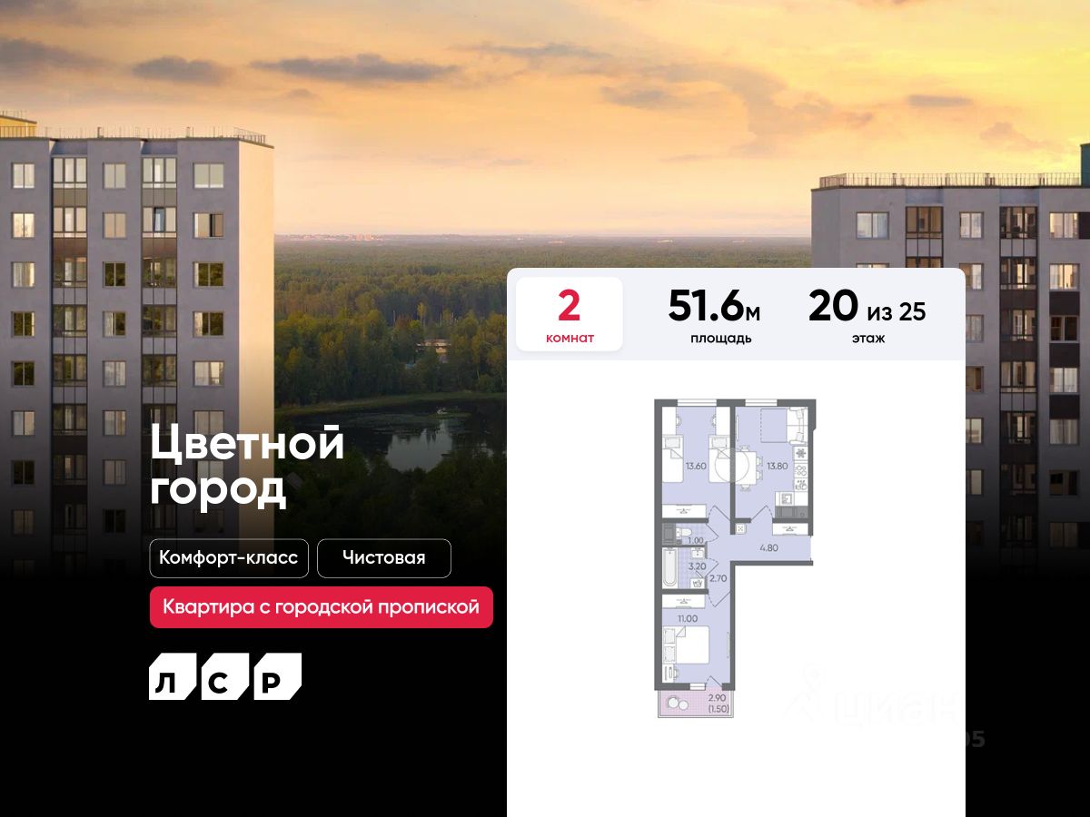 Продается 2-комнатная квартира в ЖК "Цветной город" на 20 этаже. Общая площадь составляет 51.60 кв. м. Квартира с чистовой отделкой Срок сдачи дома: 3 квартал 2026. Жилой комплекс "Цветной город" располагается по адресу Санкт-Петербург, Красногвардейский.