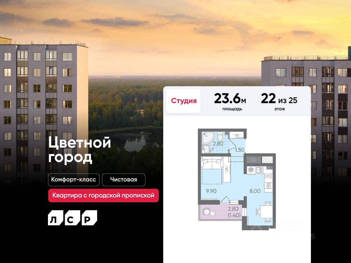 Продается студия в ЖК "Цветной город" на 22 этаже. Общая площадь составляет 23.60 кв. м. Квартира с чистовой отделкой Срок сдачи дома: 3 квартал 2026. Жилой комплекс "Цветной город" располагается по адресу Санкт-Петербург, Красногвардейский.